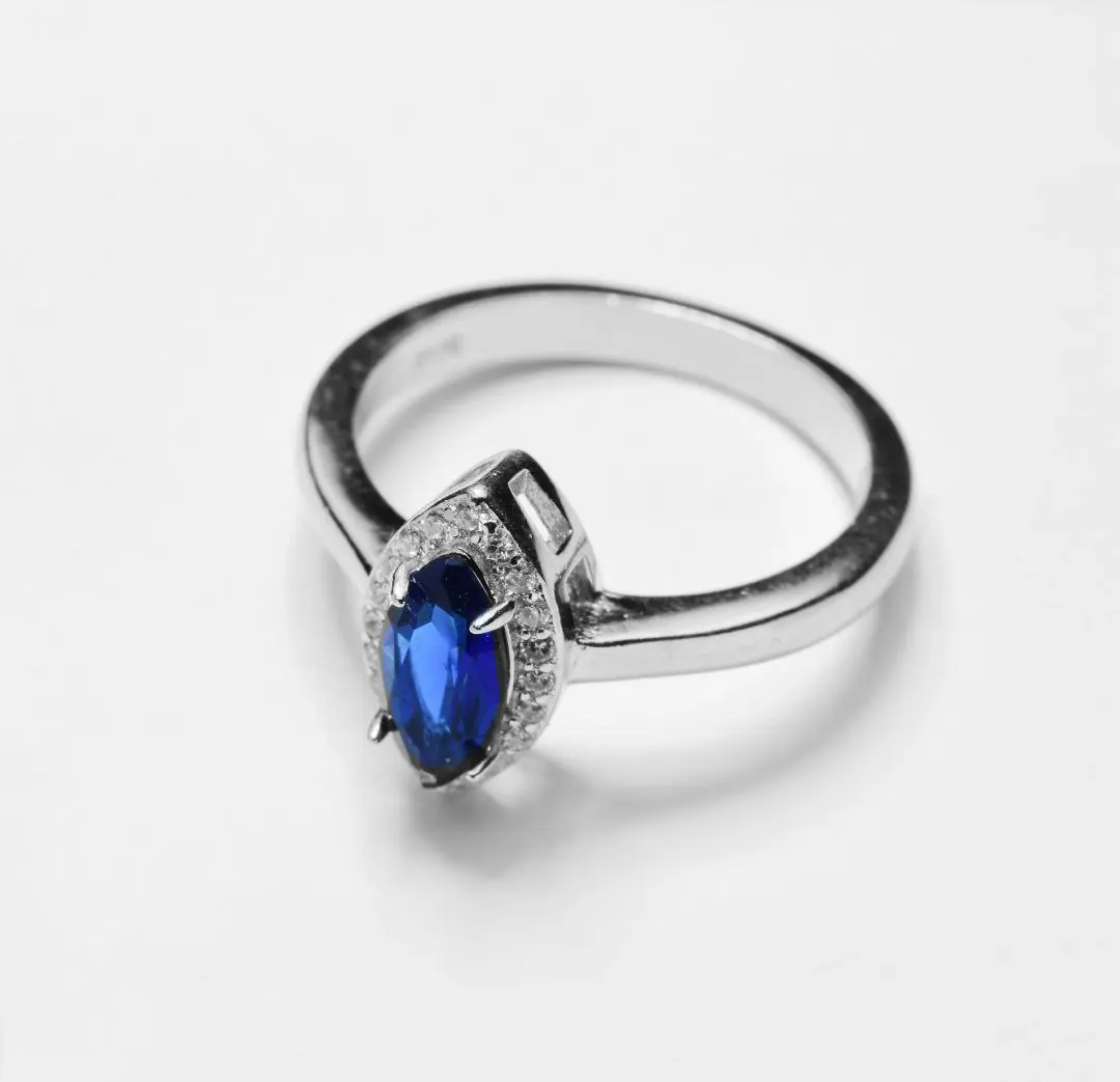 سلفر بفص زيركون ازرق شكل بيضاوي مسحوب من الطرفين حوله فصوص زيركون صغيره مقاس 20