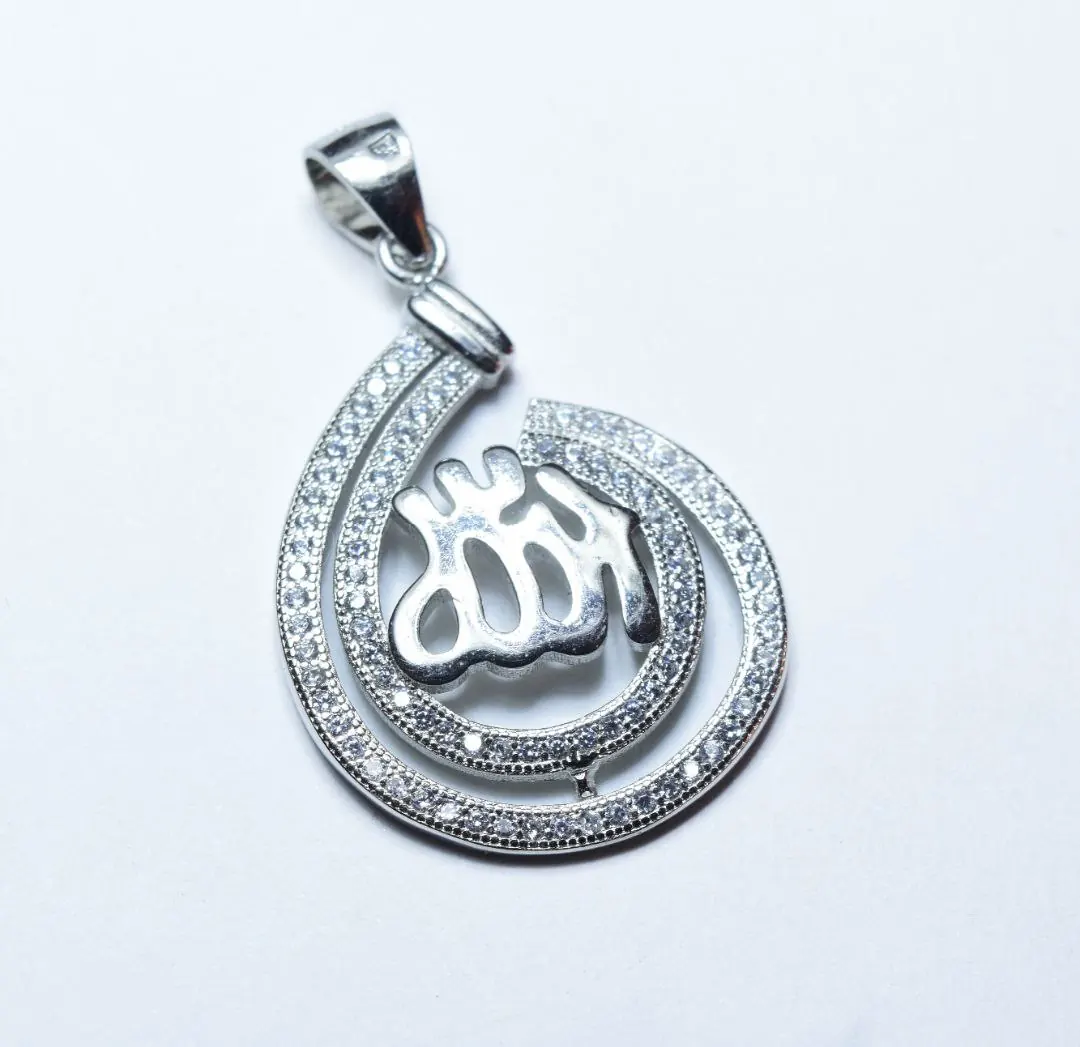 سلفر شكل قطرة ماء غير مكتمله مزينه بفصوص زيركون داخلها لفظ الجلاله ” اللّه “