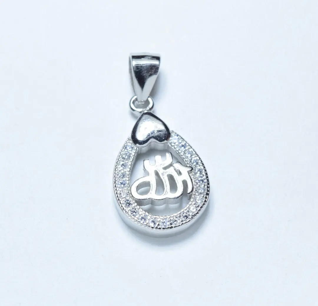 سلفر شكل قطرة ماء مفرغه مزينه بفصوص زيركون صغيره اعلاها قلب مقلوب وبداخلها لفظ الجلاله ” اللّه “